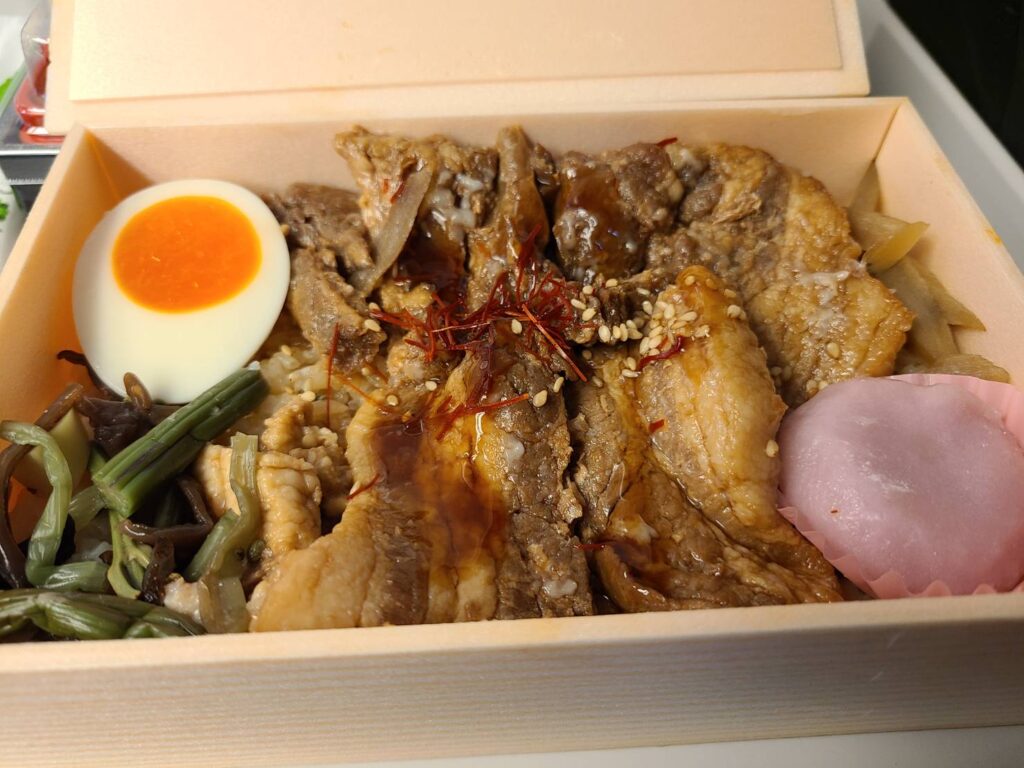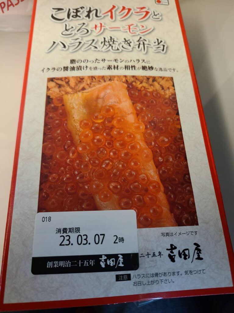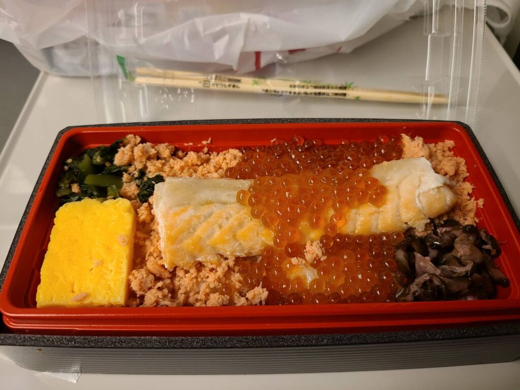 身体も気持ちもウキウキした状態で、帰りの新幹線に乗り込みお腹ペコペコ状態なところにこのこぼれイクラととろサーモンハラス焼き弁当をいただきました!