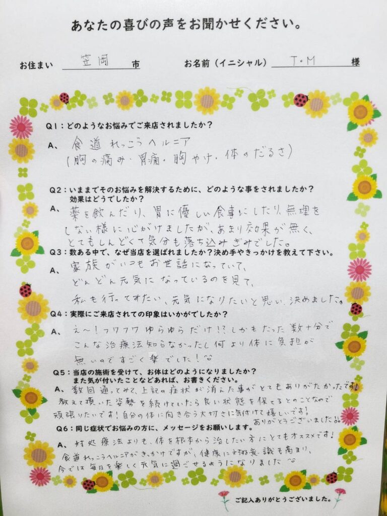 A. 対処療法よりも、体を根本かっら治したい方にとてもオススメです!食道れっこうヘルニアがきっかけですが、健康に対する意識も高まり、今では毎日を楽しく元気に過ごせるようになりました。