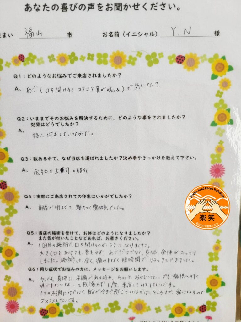 大きく口をあけても音もせず、あごだけでなく身体全体がスッキリしました。