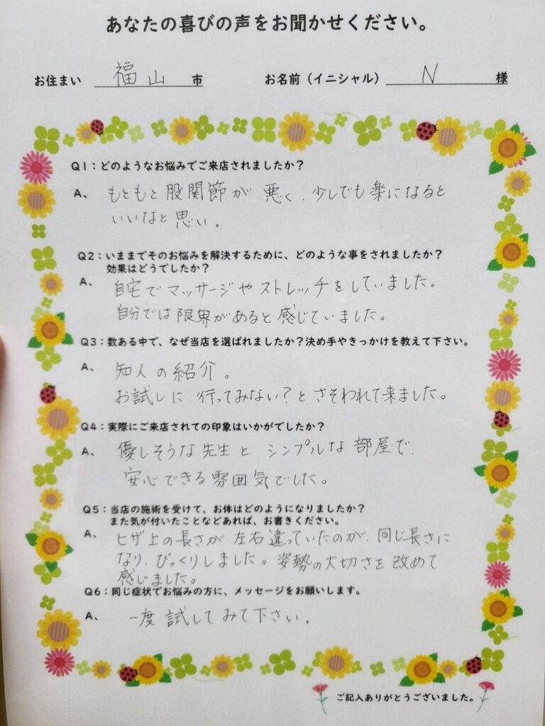 A. ヒザ上の長さが左右違っていたのが、同じ長さになり、びっくりしました。姿勢の大切さを改めて感じました。