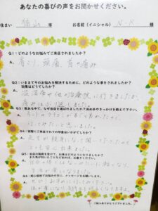A. 左腕のしびれがなくなりました。ユラユラしていただくのが最高に気持ち良いです。