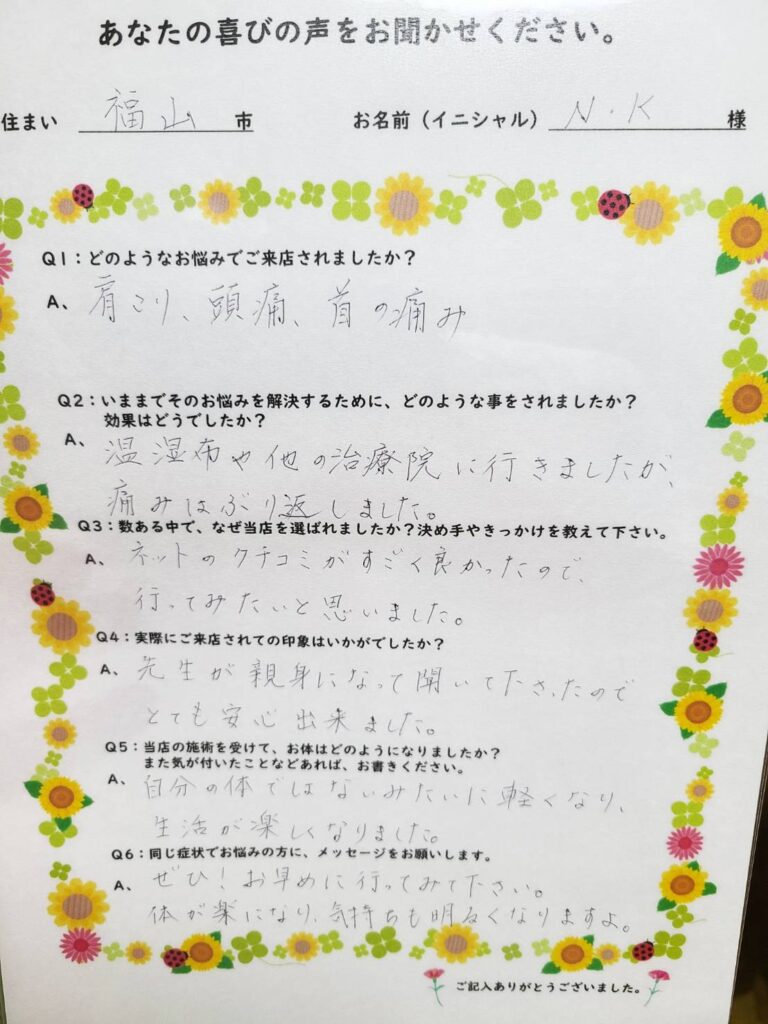 A. ぜひ、施術をうけてほしいです。楽になります。