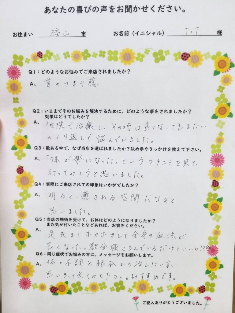 A. ひどくなる前に施術を受けて早く楽になってほしいです。早めに楽になってほしいです。早めに施術をしてもらって良かったです。ぜひ体感してほしいです。