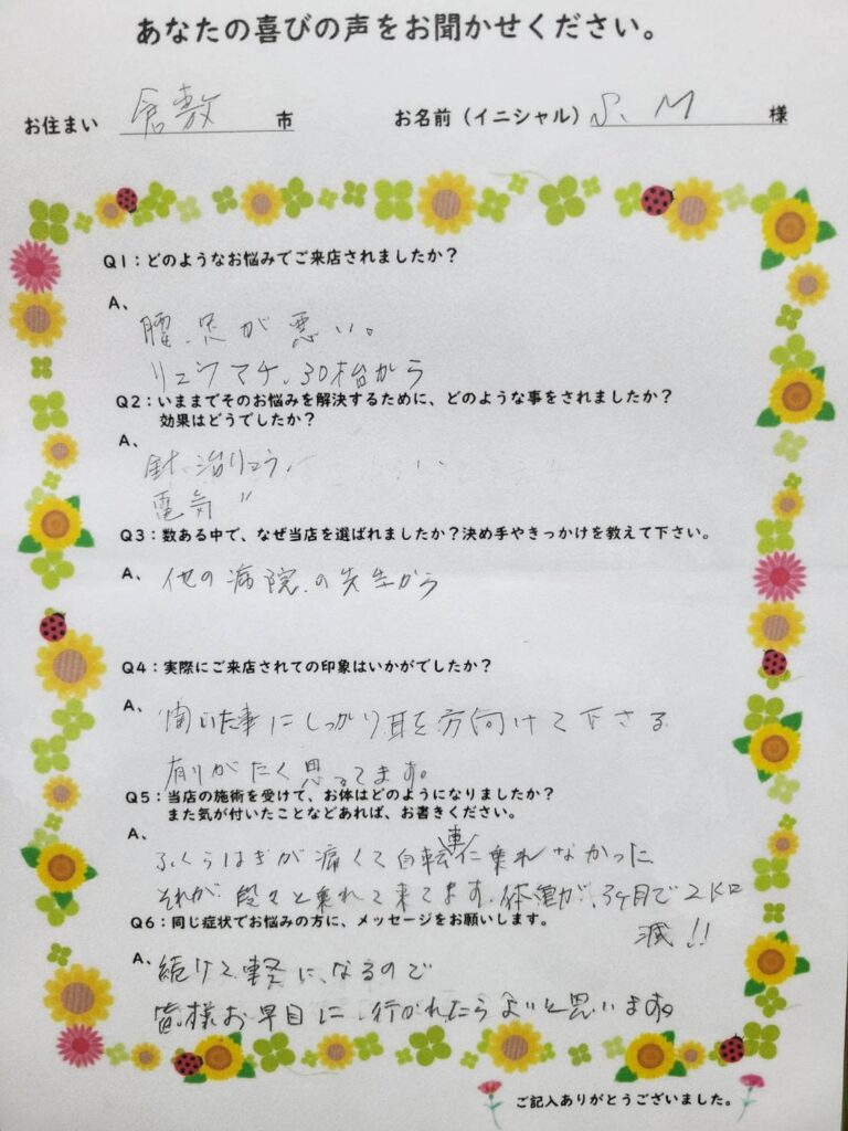 A. 半信半疑で痛みがとれる?サロンの中もすごくいやされ感がありやってみようと思いました。やっぱり先生の笑顔が素敵でした。