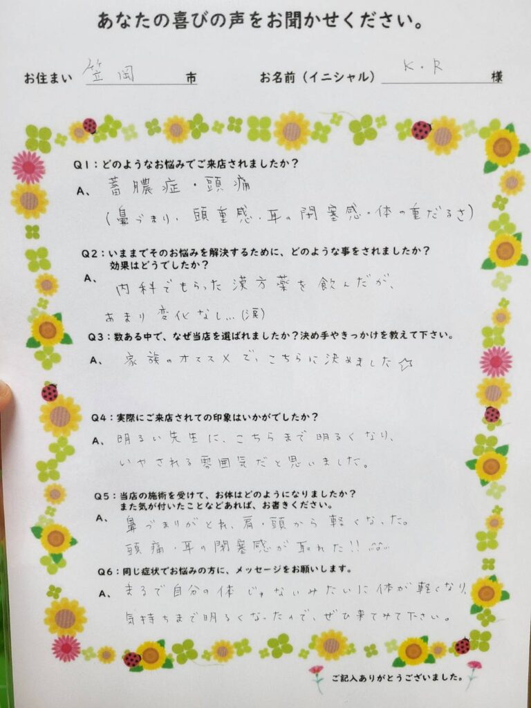 A. 鼻づまりがとれ、肩、頭から軽くなった。頭痛、耳の閉塞感が取れた!!